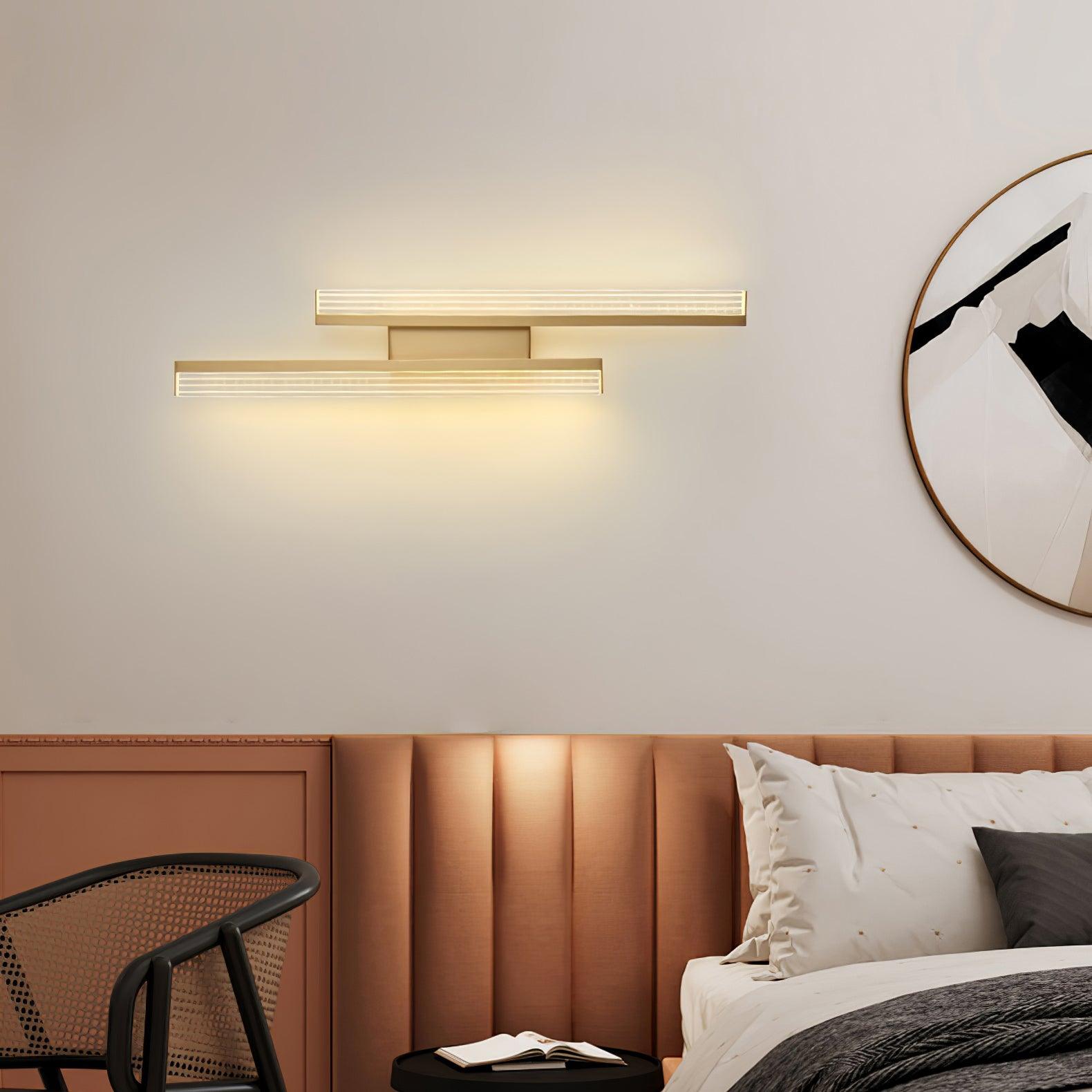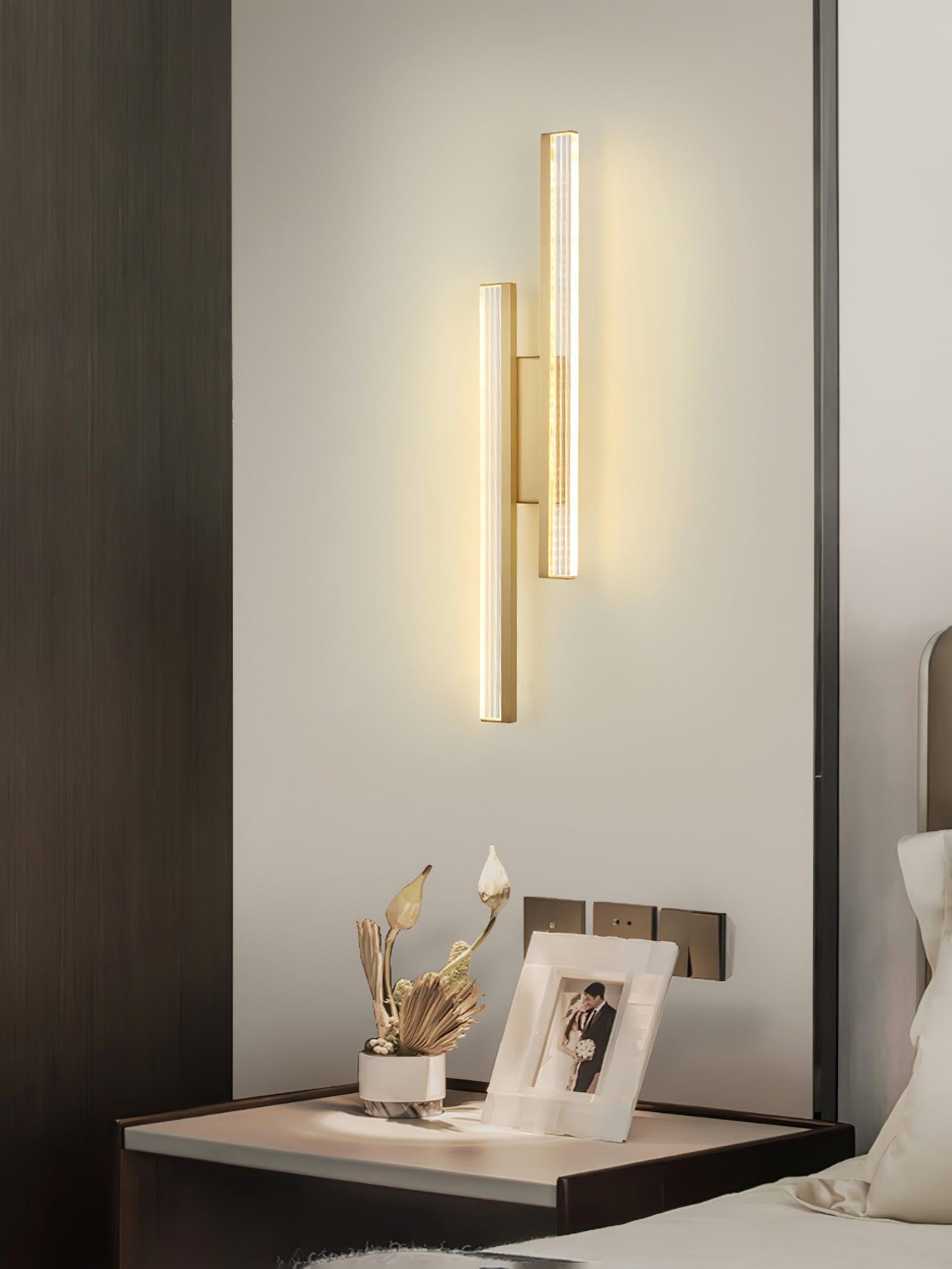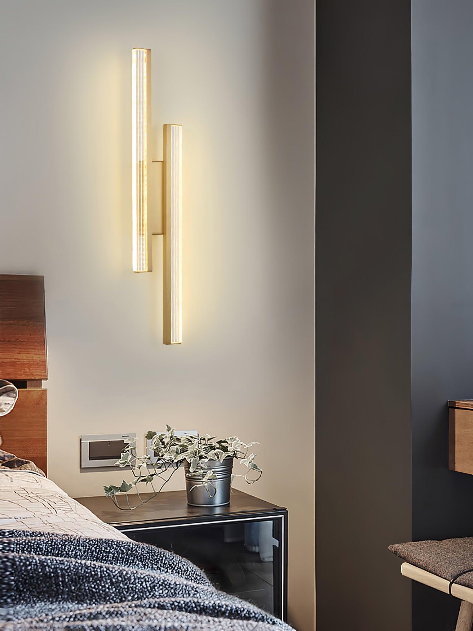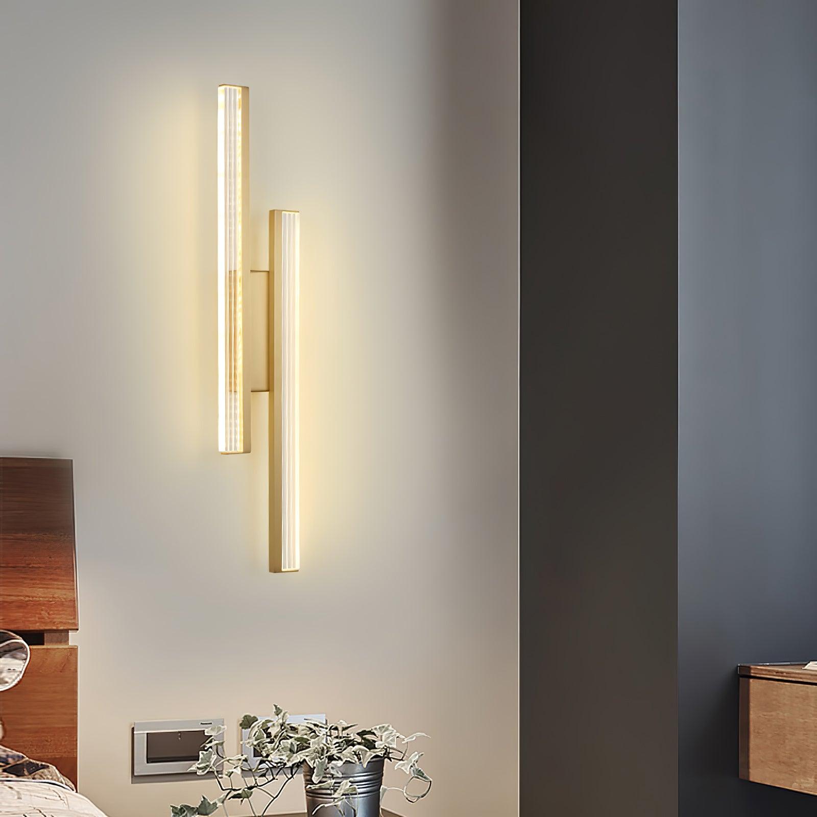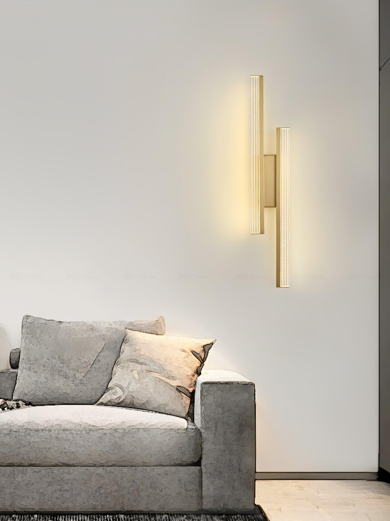 Stylish chic look 2 lights wall sconce. Structured 2 long pipes that were symmetrically connected and distributed from the 2 sides of the rectangle base. Acrylic tubes are just in the center of the lamp. Cool designs make it not only a lamp but as well as a decor piece when light is not illuminated design, makes it not only a lamp but also an ornament when there is no light.